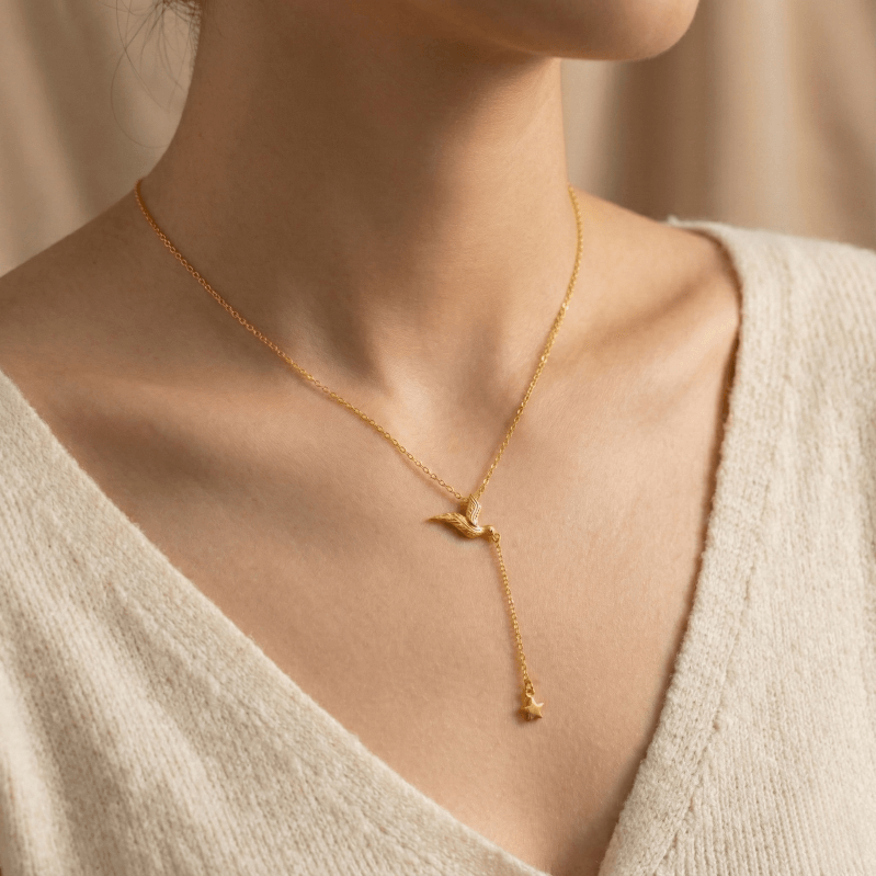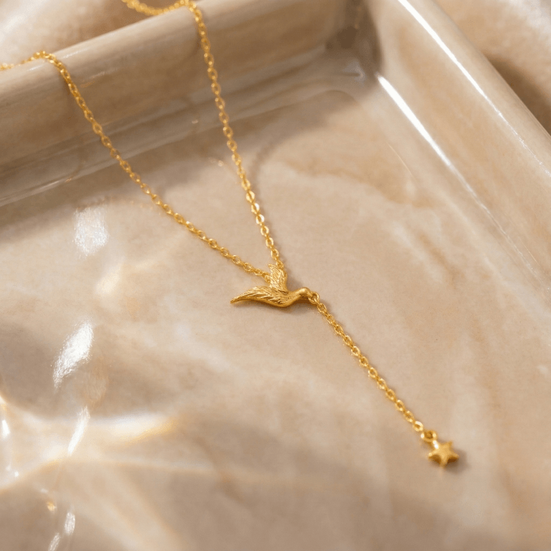 Crafted in 925 sterling silver and finished with a refined gold plated finish, the Astra Flight Necklace features a minimalist bird charm paired with a graceful chain drop ending in a tiny star. Lightweight and fluid, the design moves naturally with the body, creating a soft, elegant silhouette.