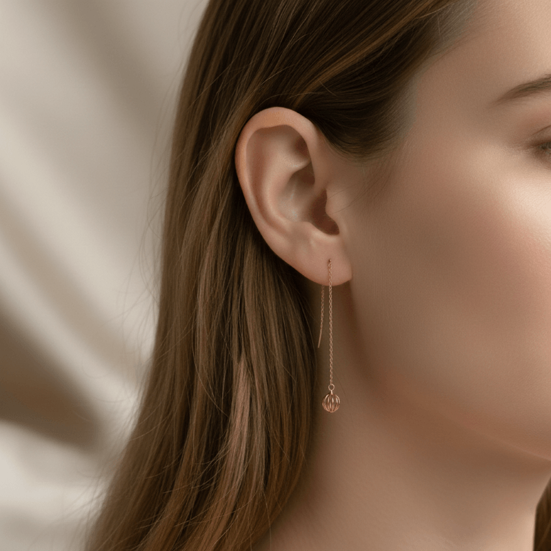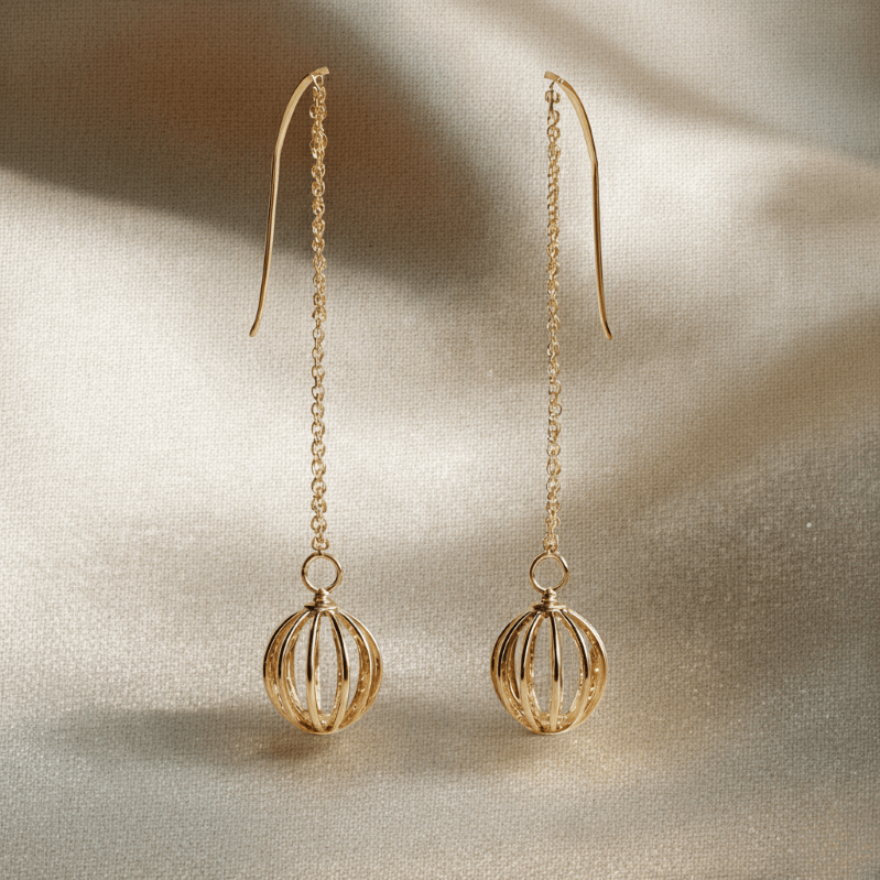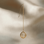A slender gold hook leads into a delicate chain, allowing the open cage sphere to float freely with movement. The design plays with space rather than mass — creating presence without weight. Finished in warm gold plating, every curve is intentional, allowing light to pass through and reflect softly from within.