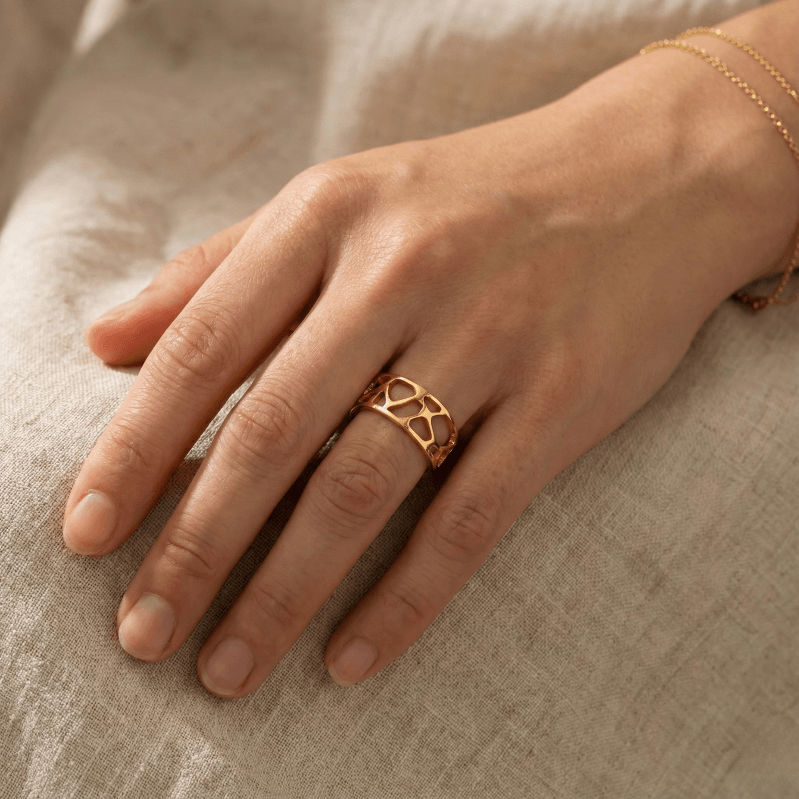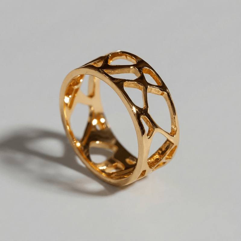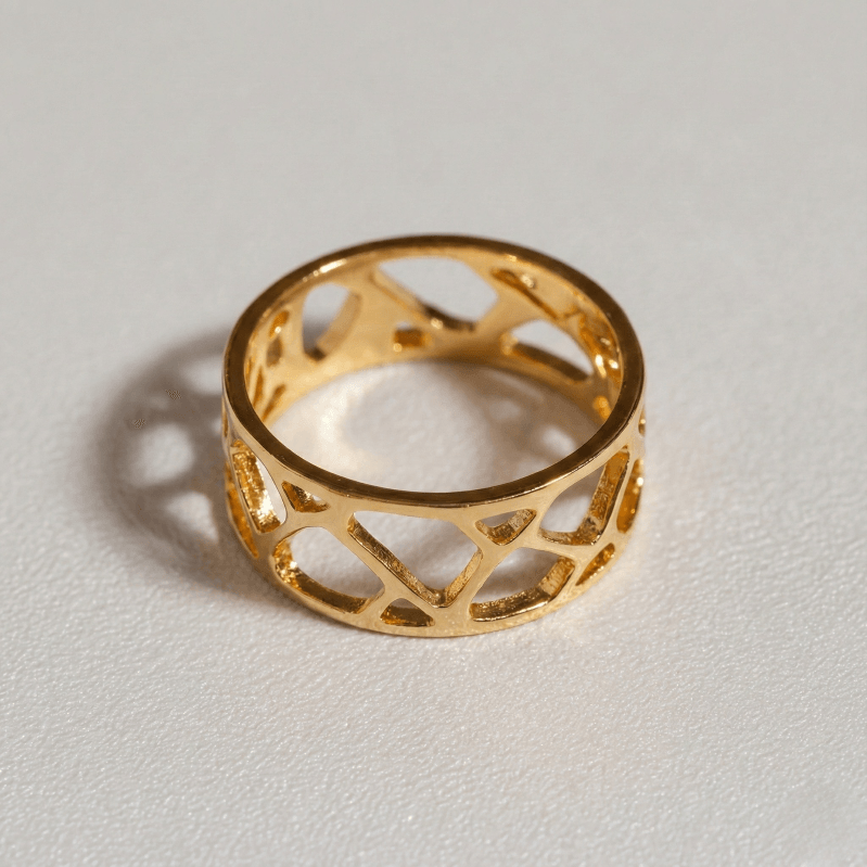 Crafted in 925 sterling silver with a polished gold-plated finish, the Geo Lattice Ring features a bold wide band with a refined geometric cut-out pattern. The open lattice design reduces weight while maintaining a strong, sculptural presence on the finger.