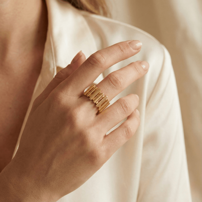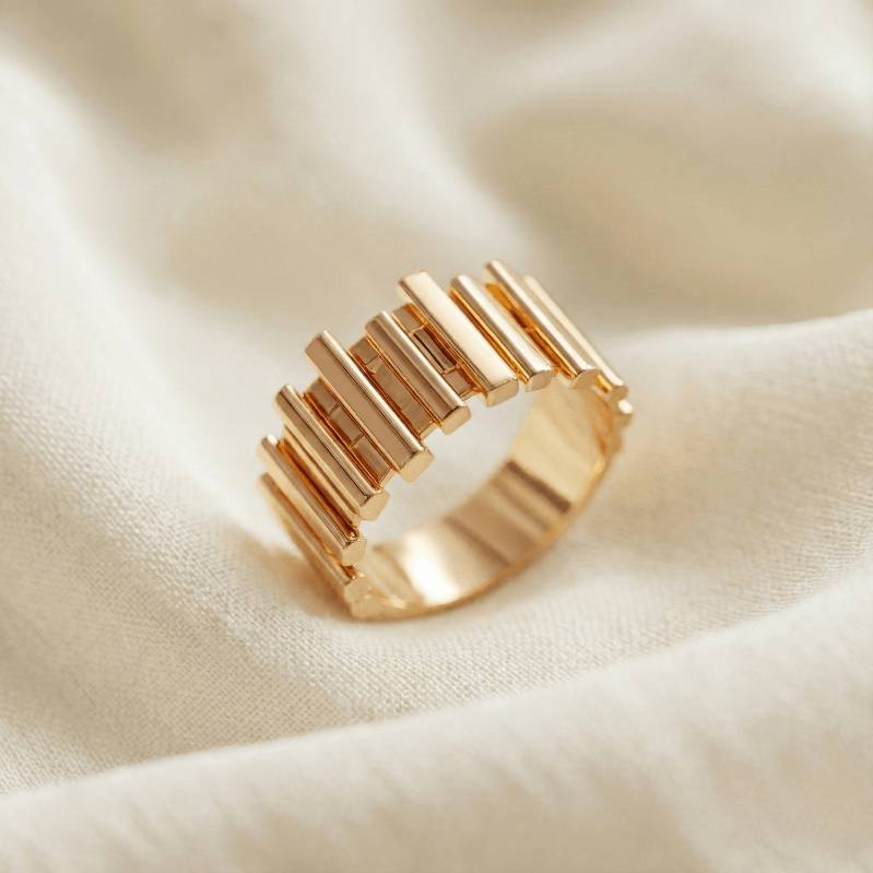 Clean lines and repeated form, the Linear Rhythm Ring reflects balance through structure. Each polished bar is placed with intention, creating a steady visual rhythm that feels modern, confident, and composed. The design celebrates precision without excess.