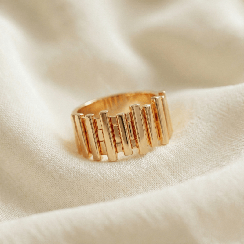 Crafted in 925 sterling silver with a polished gold-plated finish, the Linear Rhythm Ring features a structured band formed by a sequence of sleek, evenly spaced bars. The architectural design creates depth and texture while maintaining a refined, wearable profile.