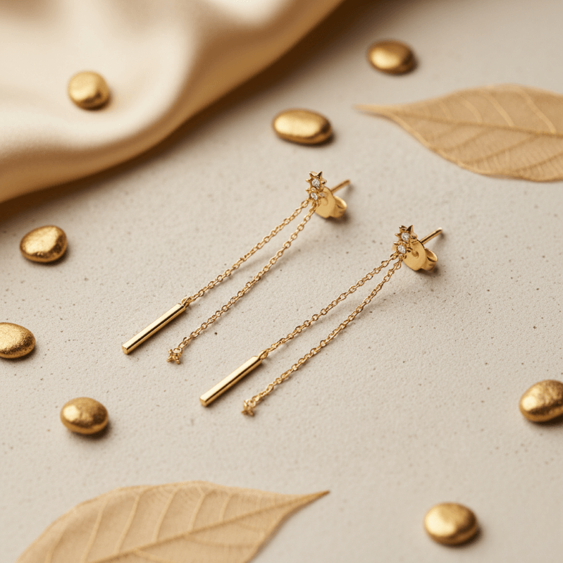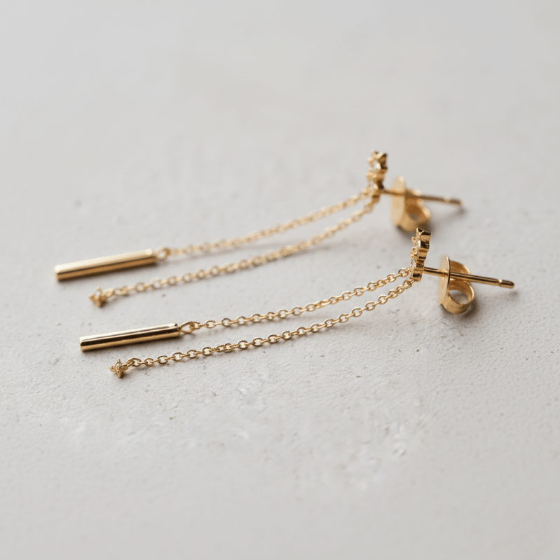 A minimal stud anchors two fine gold chains that fall effortlessly, ending in sleek polished bars. Crafted in 925 sterling silver and finished with gold plating, the design focuses on proportion rather than decoration, allowing motion and light to define the piece.