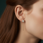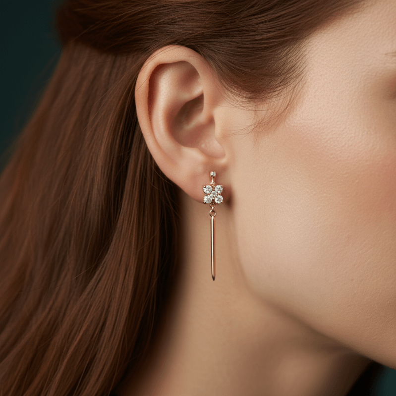 A subtle crystal flower sits close to the ear, while a sleek gold bar drops freely below, creating gentle movement and visual balance. Crafted in 925 sterling silver and finished with gold plating, the design celebrates lightness without losing definition