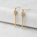 The Petal Line Gold Plated Drop Earrings are crafted in 925 sterling silver with a warm gold finish. Featuring a crystal-accented floral stud paired with a polished vertical bar drop, these earrings offer elegant movement and a slim, modern silhouette.