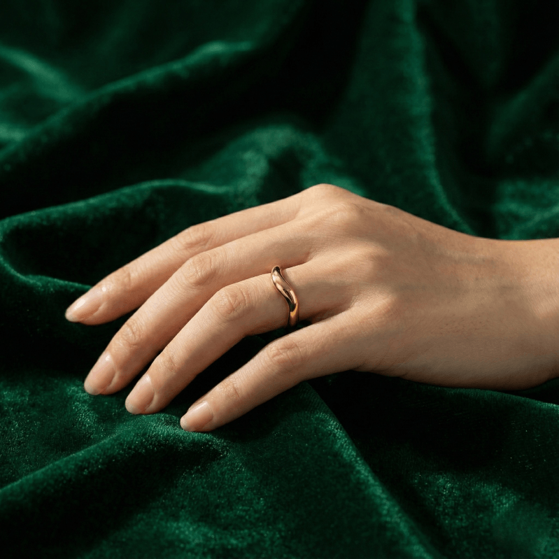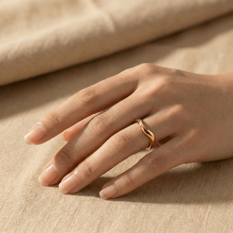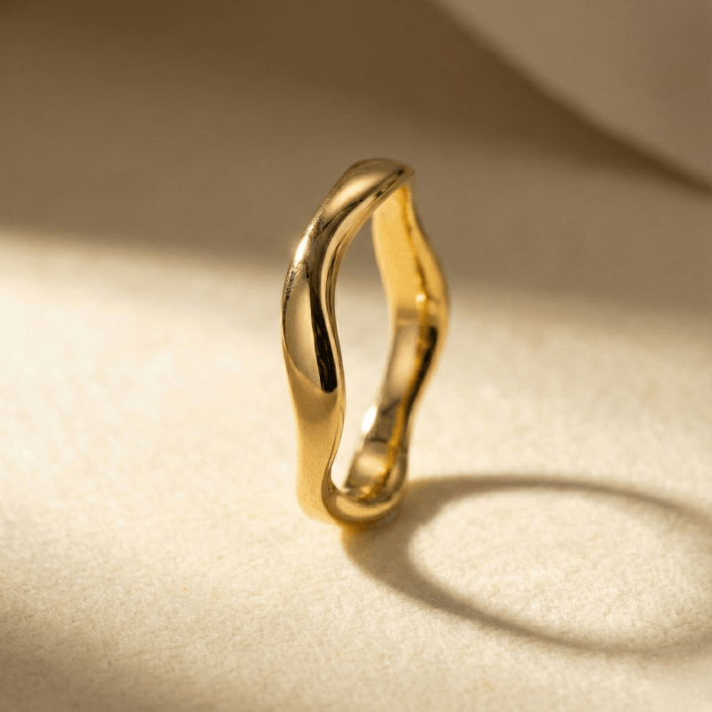 the natural rhythm of flowing water, this ring mirrors soft curves shaped over time. The uneven wave form is intentionally designed to feel organic—never rigid, never forced—just like movement in nature. Each curve reflects balance, continuity, and effortless elegance, making it a piece that blends seamlessly into everyday life.